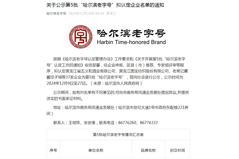 “哈尔滨老字号”拟认定企业