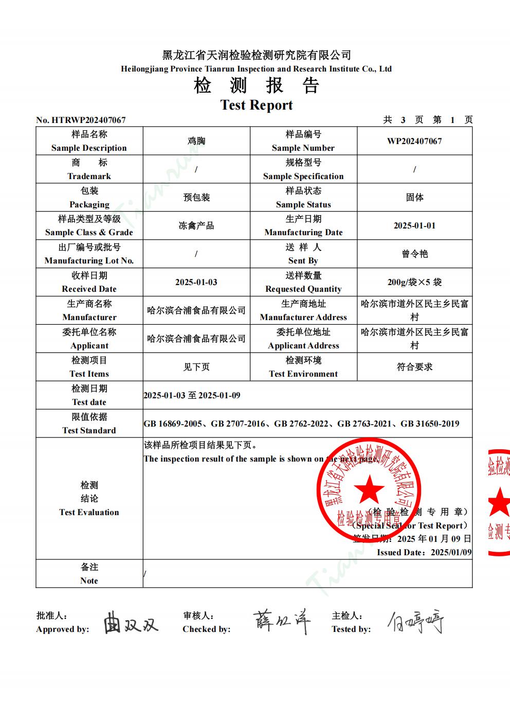 2025年1月份鸡肉产品检测报告